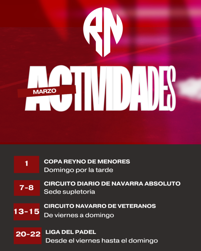 Marzo trae nuevas citas a Pádel Reyno de Navarra. El 1 de marzo se jugará la Copa Reyno de Menores; los días 7 y 8, el Circuito Diario de Navarra Absoluto como sede supletoria; del 13 al 15, el Circuito Navarro de Veteranos; y del 20 al 22, la Liga del Pádel. Un mes completo de competición en nuestras instalaciones.
